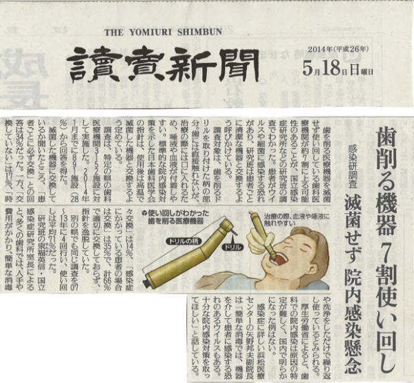 2014年に全国版の新聞で「歯を削る機器の7割が使い回されている」というデータが取り上げられたことがありました。